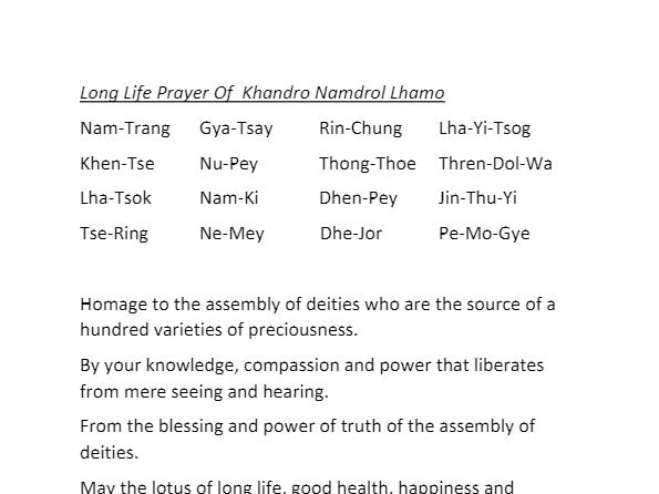 2. Om Svasti Like the countless light rays that radiate from the ruby mountain ; Exquisite Amitayu s, Lord of Everlasting L ife, who captivates and one does not tire of seeing; Whose essence is of infinite life , the nectar of immortality; Ple ase instantly grant our Guru, The Siddhi of S table and Everlasting L ife . Pad - Rab Lhun - Poi O’ser Bum Tro Tar Rab Ze Ta - Wai Mi - Ngom Tse - Pak Me Chi - Med Du - Tsi Bum Gyi Che - Chuk Pa Tak - Ten Dro - Wai Ngo - Po Deng - Dhir Tsol You are intellige nt and skilful in upholding the traditions of Buddha ; S pread ing the Holy Dharma through explanations and practices ; In order to lead disciple s onto the path to liberation; You are the o ne who is an Unequalled Guide, p lease live a long and stable life . Gang - Lo Thub - Pai Ring - Lug Zin - Khe Pa Shed Dang Drup - Pai Ten - Pa Pel - Wa Dang Dul - Ja Nam - Drol Lam - Du God - Pa La Dren - Pai Da - Dral Chog - Tu Shab - Ten Shog I request respectfully, my Precious and Holy Guru, to enjoy excellent health ; I request respectfully, my Precious and Holy Guru, to live a long life ; I request respectfully, my Prec ious and Hol y Guru, t hat your Dharma activities spread and flourish far and wide ; I request respectful ly, my Precious and Holy Guru, t o bless me to be never separated from you . La - Ma Ku - Kham Sang - La Sol - Wa Deb Chog - Tu Ku - Tse Ring - La Sol - Wa Deb Trin - Lae Dar - Shing Gye La Sol - Wa Deb La - Ma Dang - Dral Wa - Med - Par Jin - Gi Lab - Tu Sol In all my future rebirths, may I never be separated from my Perfect Guru ; May I enjoy the magnificent Dharma ; And by completing the qualities of the stages and path ; May I quickly attain the state of Vajradhara . Kye - Wa Kun - Tu Yang - Dag La - Ma Dang Dral - Me Cho - Kyi Pal - La Long Cho Ching Sa - Dang Lam - Gyi Yon - Ten Rab - Zog Ne Dor - Je Chang - Gi Go - Phang Nyur - Thob Shog